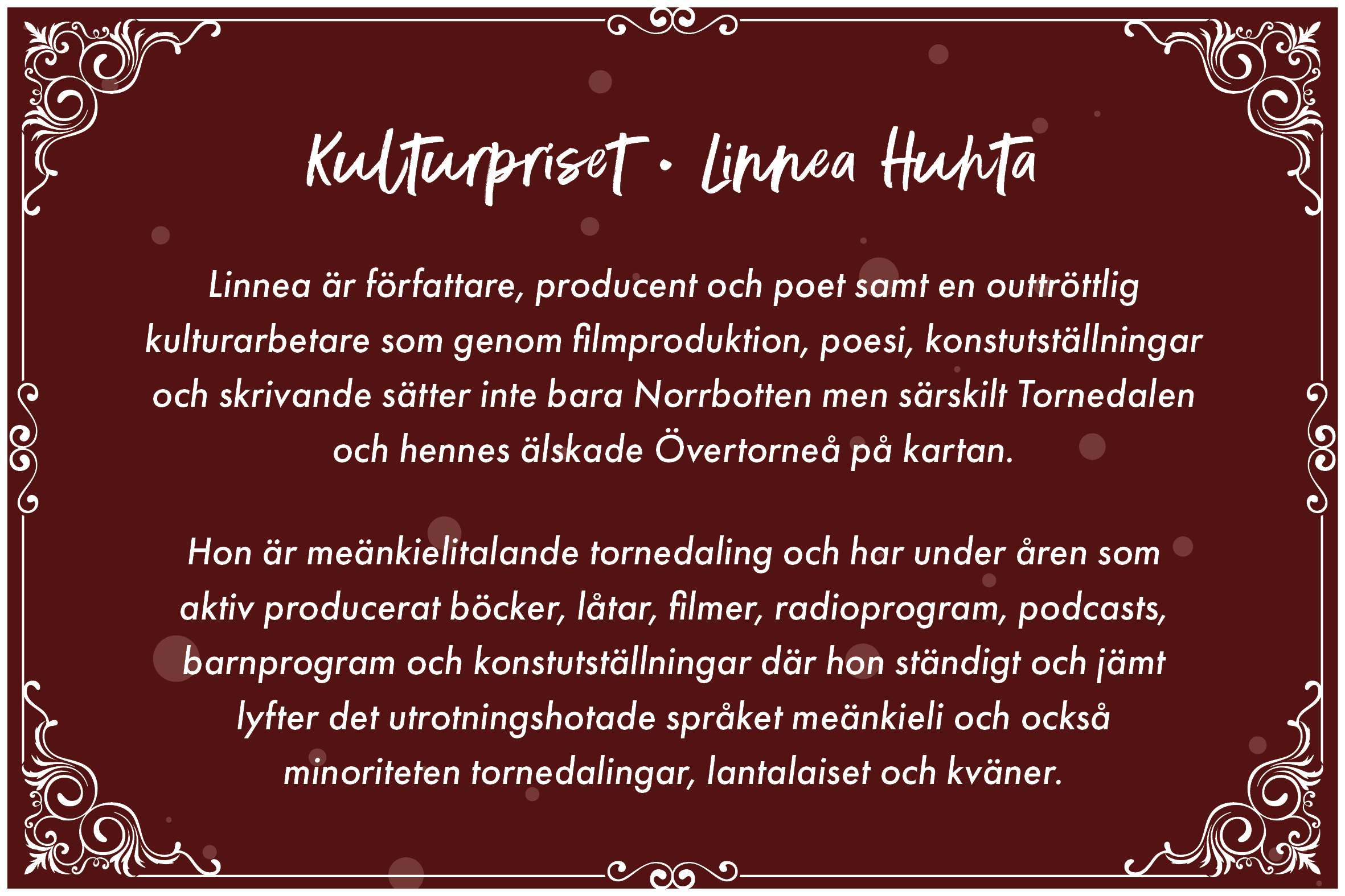 Kommundirektör Anna Andersson delade ut Lars Ahlgrens Hederspris till Ove Emanuelsson och kultur- och fritidsutskottets ordförande Robert Grape delade ut stipendier till Boozepack cruisers, Theresa Palo, Linnea Huhta och Minja Ylitalo-Pieti som alla gjort enormt viktiga insatser för kommunen.