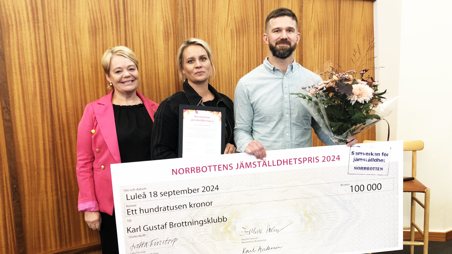 På Norrbottens jämställdhetsdagar i Luleå igår 18 september fick Övertorneåföreningen Karl-Gustaf Brottningsklubb ta emot årets jämställdhetspris på 100 000 kr från landshövdingen med följande motivering: “Årets pristagare har i många år arbetat för att bereda plats för tjejer och kvinnor i en miljö där